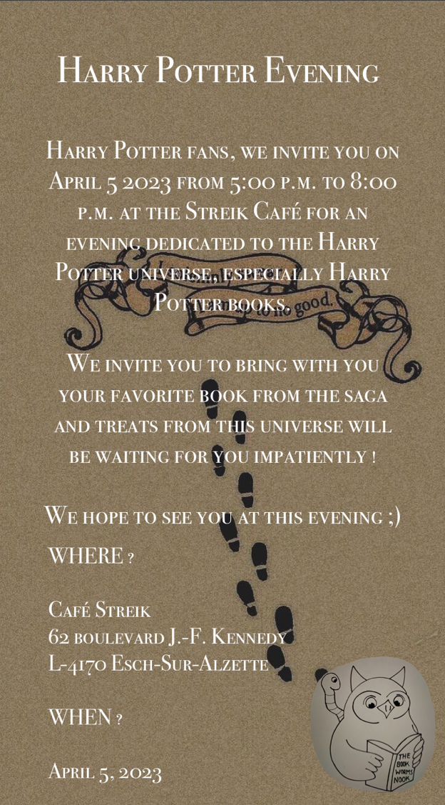 We will be hosting different events themed on different books. We aspire to organize a Harry Potter themed afternoon, where different snacks of the series will be waiting for you and everyone is invited to bring their favourite book of the series and talk about it.