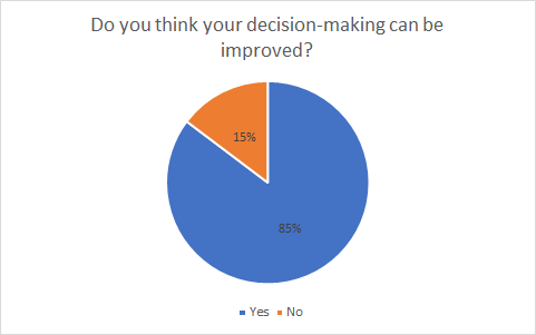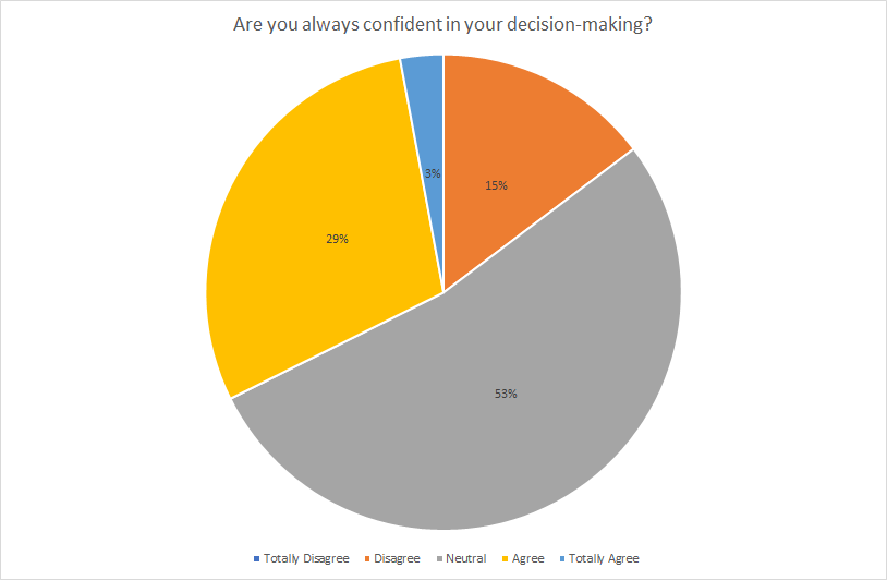 We did a survey about how people react to making difficult choices and found out that most people felt neutral about their decision-making skill, meaning most participants were neither sure nor unsure about making the right choice. However, over 80% believe that their decision-making skill could be improved.